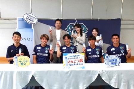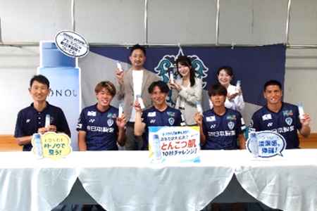 選手・監督・コーチ・スタッフの皆さまへ、男性向けスキンケアブランド『TONOU(トノウ)』の「トノウ オールインワンパウダーローション」を進呈いたしました。また、アビスパ福岡の皆さまにご参加いただき、新商品の特徴である「皮脂ケア」をテーマにした特別企画「お肌ととのってる?とんこつ肌10秒チャレンジ!」を実施しました。