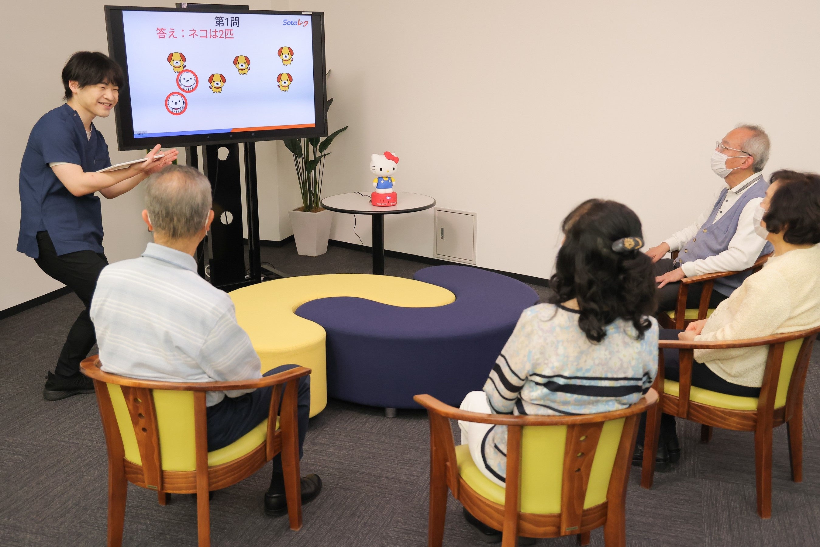 ハローキティロボットがコンテンツ映像にあわせて、クイズや体操等のレクリエーションの司会・進行を実施します。ハローキティロボットがレクリエーションを盛り上げ、利用者の集中力維持をサポートするとともに、スタッフのレクリエーションの企画運営における業務負担の軽減に役立たせることが可能です。