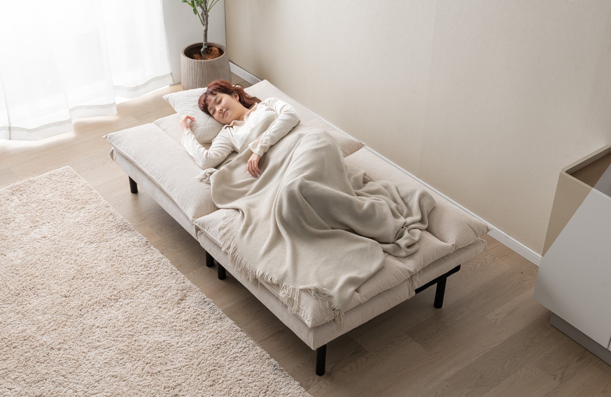 ソファの全面を最大限使ってゆったりとくつろぎたいときやお昼寝時、来客時のベッドとしても使用できるスタイルです。