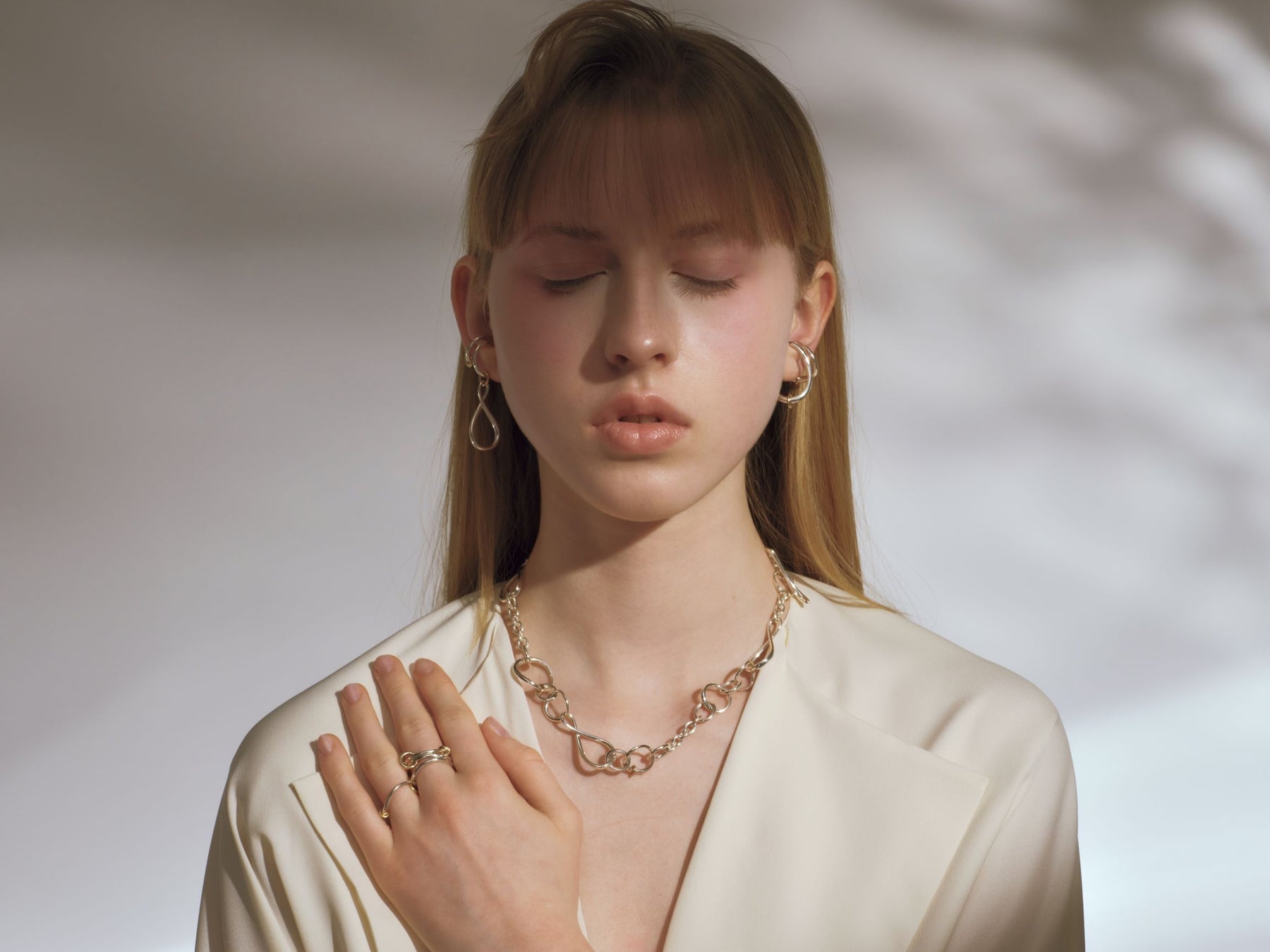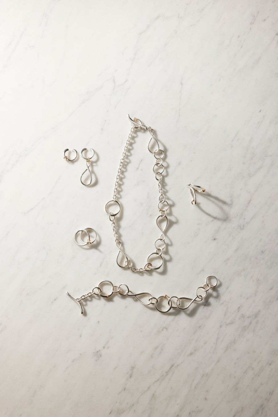 ランダムに繋いだ様々な形状の輪が生み出す心地よいボリューム感と、無垢なシルバーにさりげないアクセントをプラスするゴールドパーツとの繊細なコンビカラーで、コーディネートをスタイリッシュに仕上げてくれるジュエリーがラインナップ。