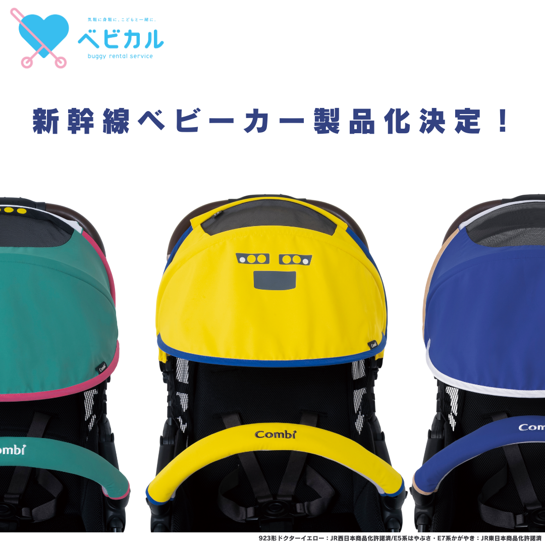 ○この度、コンビ株式会社と連携し、小さなお子さまに人気の新幹線をモデルとした3種類のオリジナルベビーカーの製品化が決定し、お客さま販売に向けて動き出しましたのでお知らせいたします。ベビカル限定でレンタルいただける「E5系はやぶさ」・「E7系かがやき」に加えてベビカル会員さまアンケートで選ばれた「923形ドクターイエロー」をラインナップいたします。