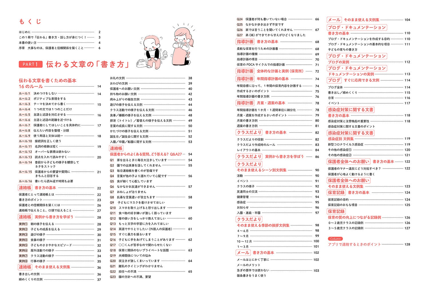 保護者への謝罪/保護者へのお願い/保護者へのねぎらい/保護者への感謝/登園・降園時/電話連絡/円滑なコミュニケーションのために/信頼される聞き方の基本 7のルール/子どもへの言葉かけのポイント