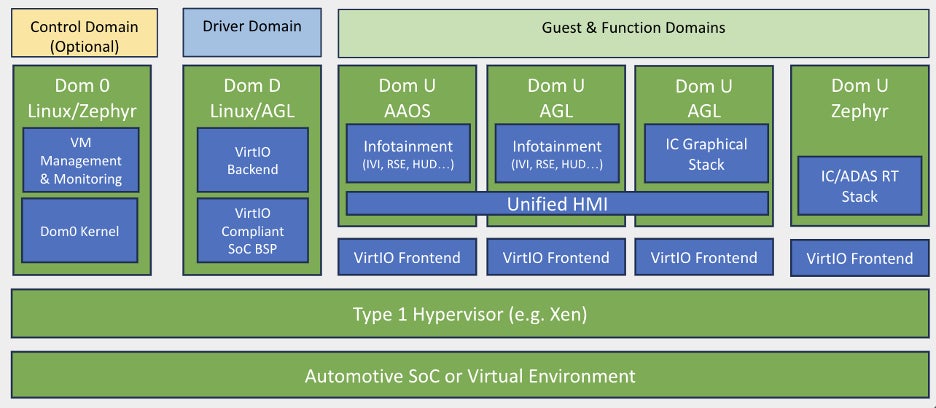 VirtIO:OASIS により標準化され、Linux カーネルにも実装されているデバイス仮想化のための共通インターフェースで、ソフトウェアをハードウェアから切り離すことにより、車両バリエーション間で柔軟に展開できるようにします。