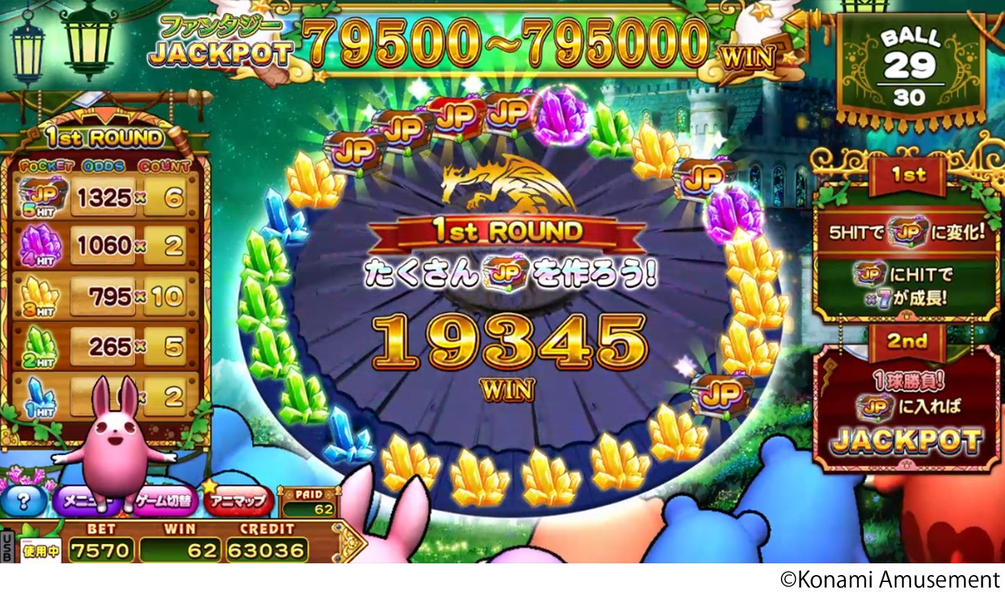 「ファンタジーJACKPOT CHANCE」では「1st ROUND」と「2nd ROUND」のふたつのステージがあり、「1st ROUND」で成長させた宝箱を「2nd ROUND」で狙うことで、大量のメダルを獲得するチャンスが広がります。