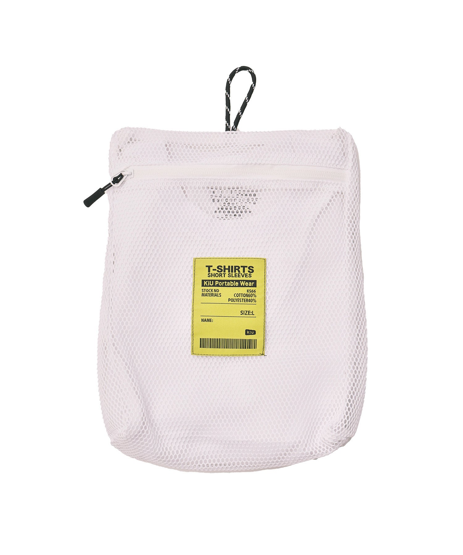 ファスナーを閉めるだけで簡単に圧縮できる収納ポーチ。薄手のTシャツであれば最大約15枚の収納が可能です。前後で収納スペースが分かれているため、着用前後の衣類を分けて整理できる仕様。メッシュ素材を採用し、中身がひと目で確認できる点もポイントです。