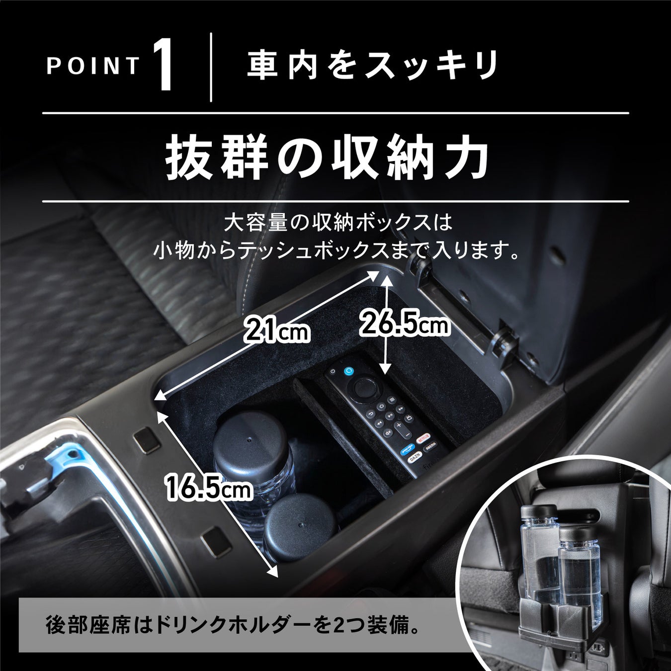大容量収納小物からティッシュボックスまでしっかり収納可能。後部座席にはドリンクホルダーを2つ装備し、使い勝手も抜群です。