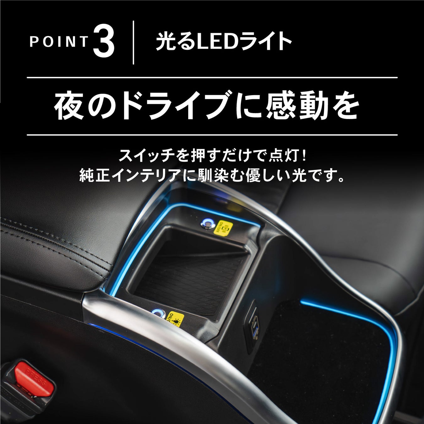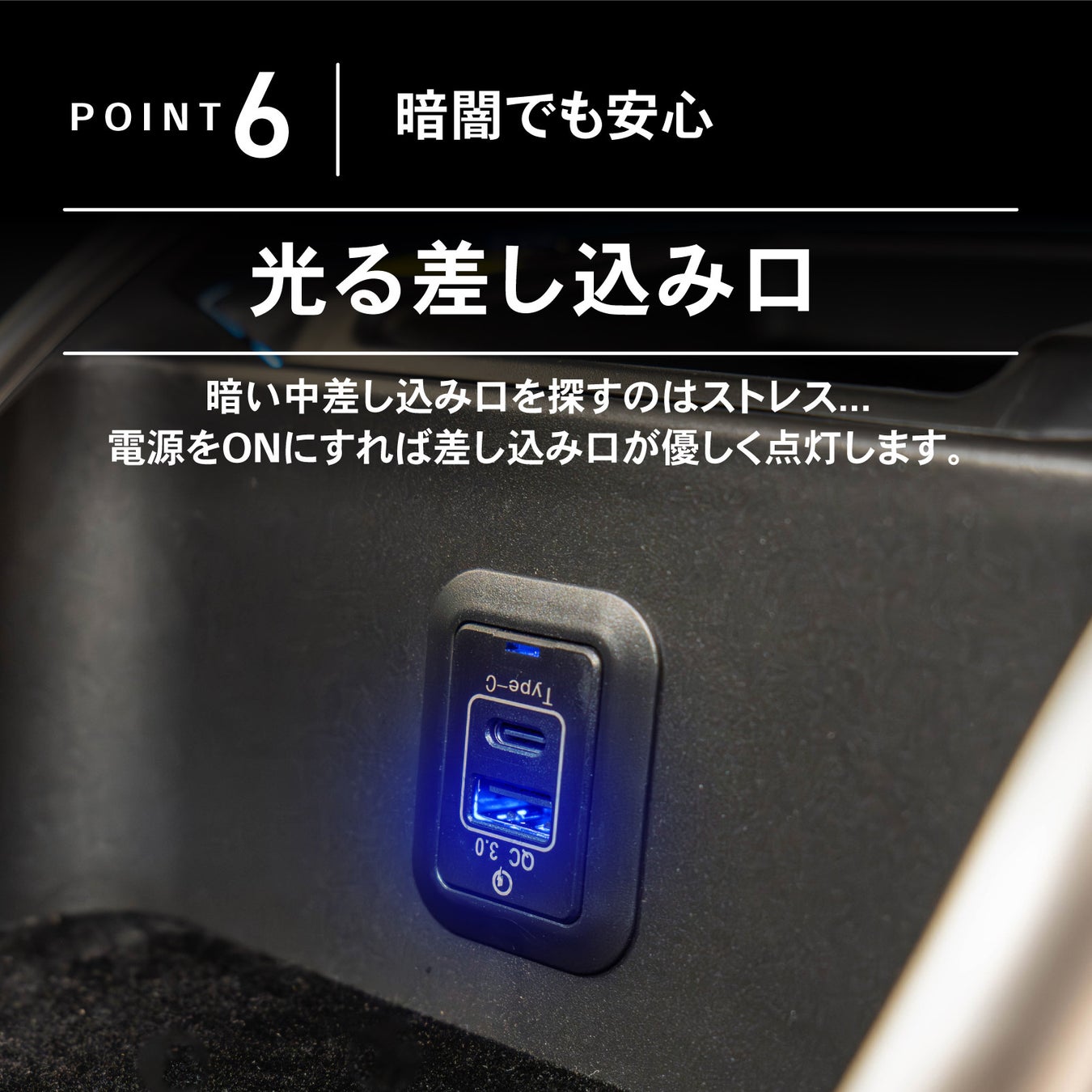 光るUSB差し込み口暗い車内でも迷わずに差し込みが可能。ストレスフリーな充電環境を実現。