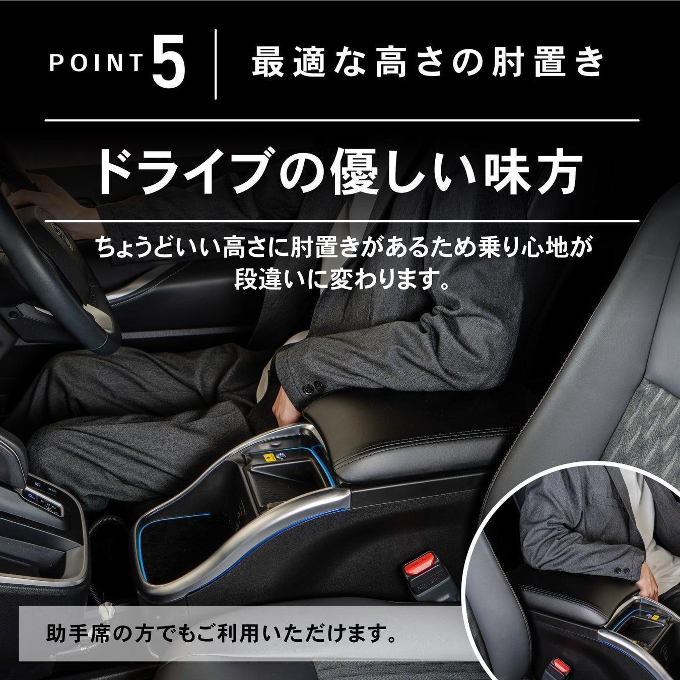 快適な肘置き長時間の運転でも疲れにくい、最適な高さのアームレスト。助手席の方にも快適なドライブ環境を提供します。