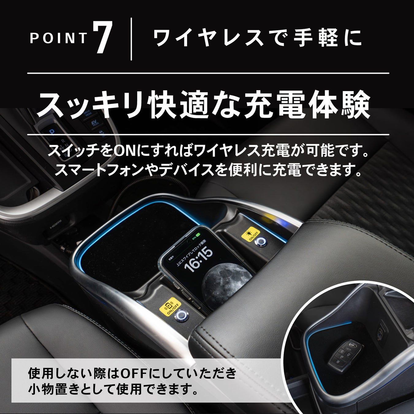 ワイヤレス充電対応スイッチをONにするだけでスマートフォンを置くだけ充電。使用しないときは小物置きとして活用できます。