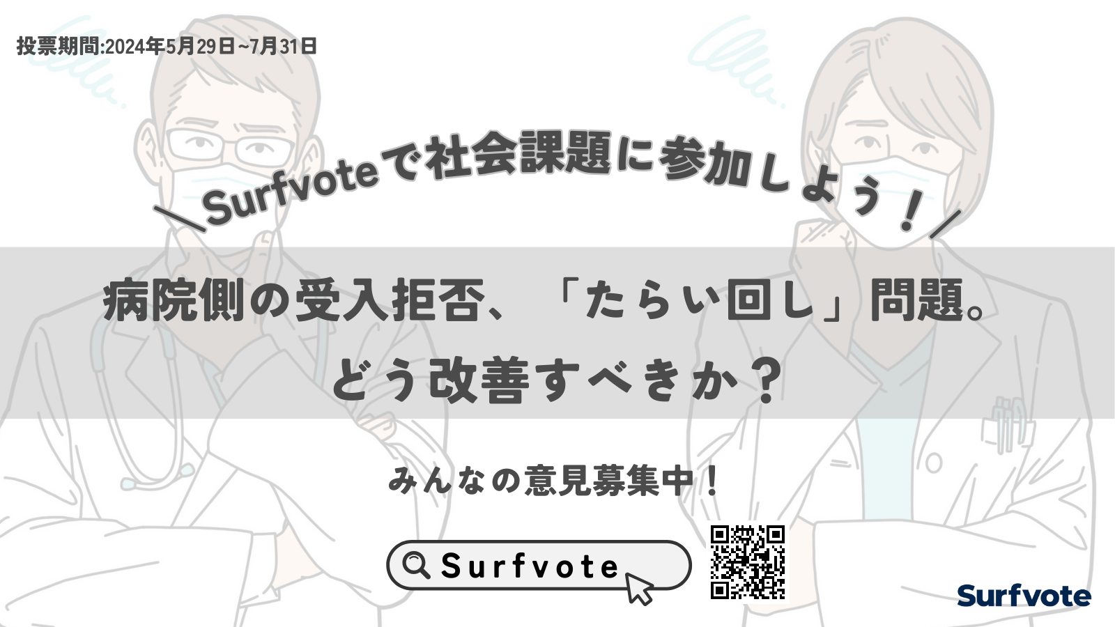 このイシューでは、病院の受け入れ拒否や救急搬送の困難事案についての現状と、その改善策について議論します。イシューはこちら:https://surfvote.com/issues/44pkuprytuf2