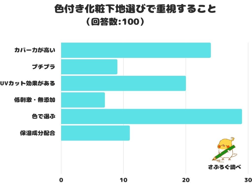 色付き化粧下地選びで重視することをアンケートにて調査したところ、1位は「色で選ぶ」 でした。