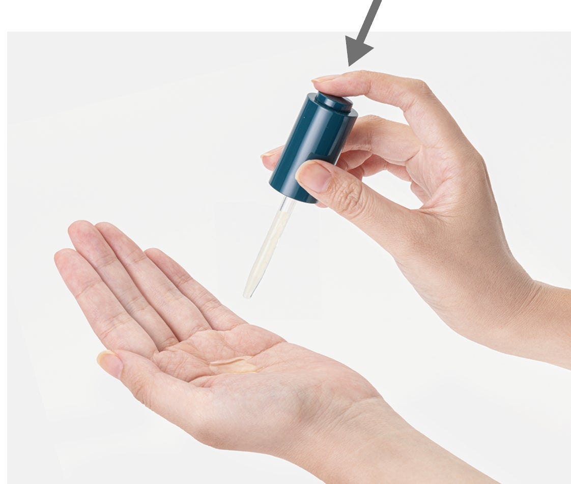 〇美容液は、1回分の使用量が自動で吸い上げられる自動吸い上げ容器。キャップを回し、上部のボタンを押すと美容液が出てきます。