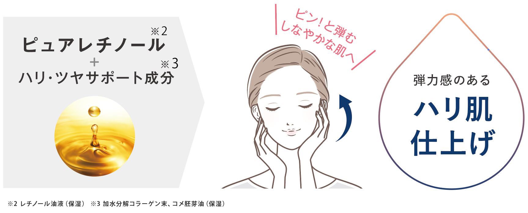 ほかピュアレチノール※2とハリ・ツヤサポート成分※3だけでなく、美容液にはレチノール誘導体※4も配合。弾力感のあるハリ肌へ仕上げます。