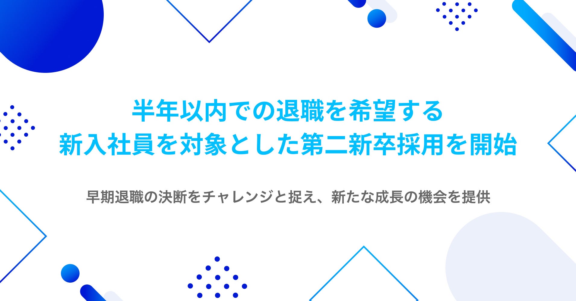 当社は、採用の過程において確率論で早期退職を懸念するのではなく、新入社員が自身のキャリアや志向性に向き合い早期退職を決断することを新たなチャレンジと捉え、それぞれの採用候補者に合う活躍の場を提供することを目的として、第二新卒者向けの「チャレンジ応援採用」実施を決定しました。