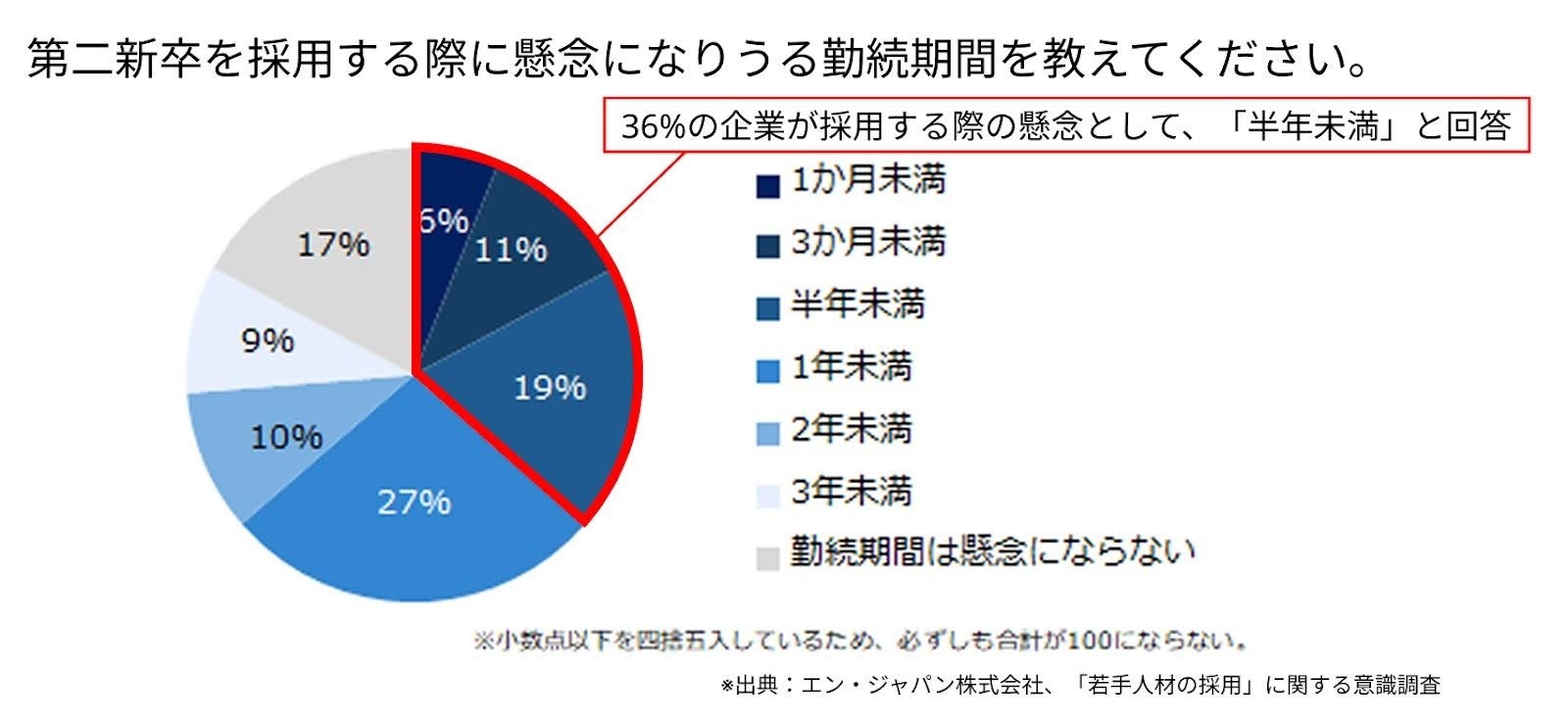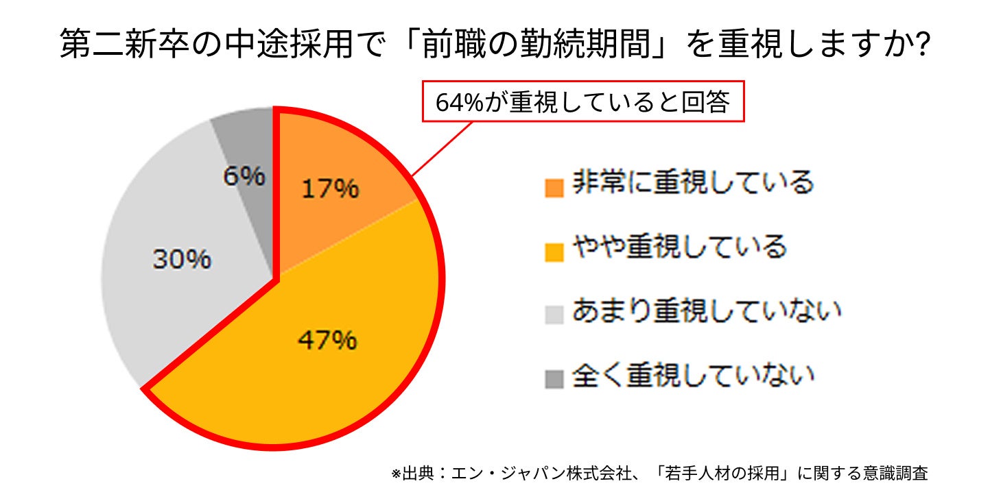一方、第二新卒の採用において、64%の企業が「前職の勤続期間」を重視。勤続期間が「半年未満」の場合、懸念になりうる企業は36%ということが分かりました。