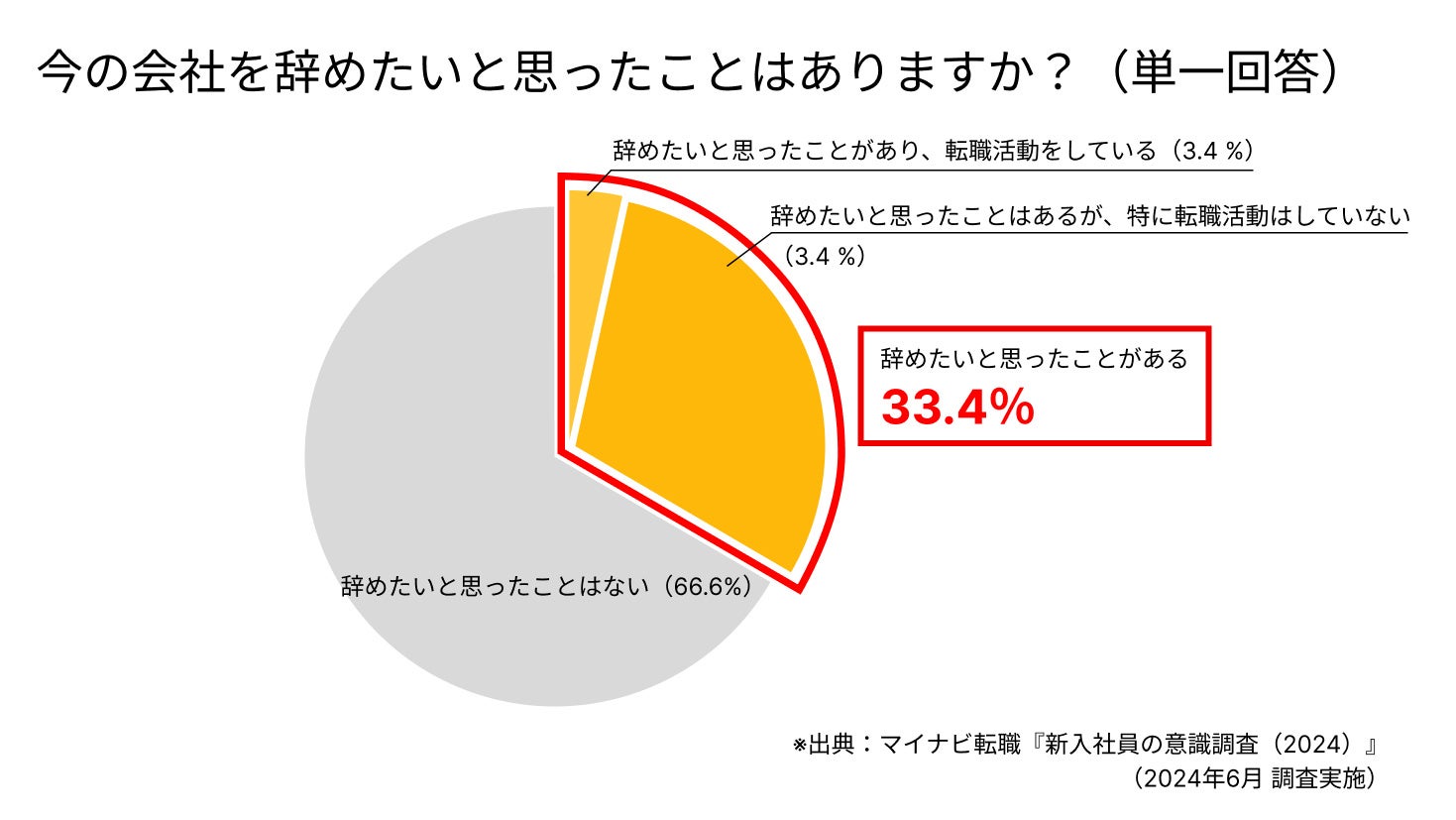 マイナビ転職が、2024年6月に調査を行なった『新入社員の意識調査(2024)』によると、昨年6月時点で会社を辞めたいと思ったことがある新入社員は33.4%という結果が出ています。