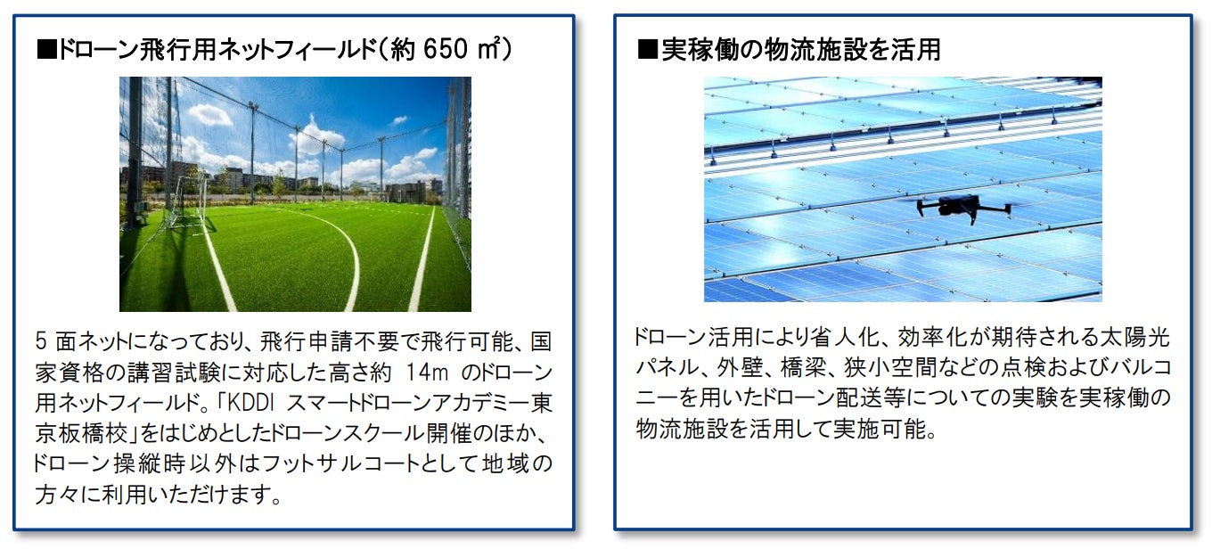 板橋DFは、東京都23区内に位置する希少なドローン技術の実験・研究の場として、河川に隣接する広大な敷地と都内最大の物流施設という特色を生かした多様な実験・研究が可能となっており、ドローン飛行用のネットフィールド、倉庫の一部スペースにドローン事業者が入居する賃貸用R&D区画、ドローン事業者が集まる交流・共創の場としてのコワーキングスペースなどを完備しています。敷地内ではAGV(無人搬送車)との連携や設置されたドローンポートを活かした点検・配送等の実験など、ドローンによるラストワンマイル配送や災害時における支援物資搬送、インフラ点検など、リアルな社会ニーズに合致した研究・実験の場として利用可能です。また、東京都内初の「KDDIスマートドローンアカデミー東京板橋校」を開校し、ドローン産業を支える技術者・オペレーターを育成する「場」も提供します。