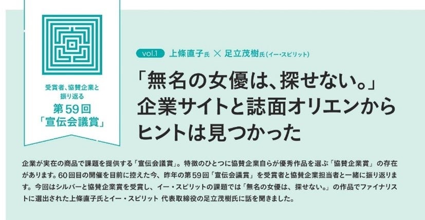 第1回は、シルバーと協賛企業賞を受賞し、イー・スピリットの課題で「無名の女優は、探せない。」の作品でファイナリストに選出された上條直子氏とイー・スピリット 代表取締役 社長の足立茂樹氏に話を聞きました。