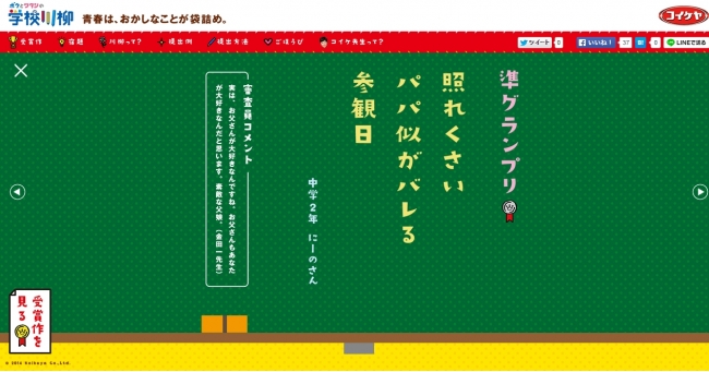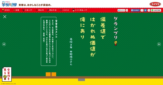 グランプリ、準グランプリ作品をはじめ、受賞作品は湖池屋ホームページにて紹介されるほか、一部は「コイケヤポテトチップス のり塩」のパッケージの裏面においても紹介されます。 今後も学校川柳を通じて、湖池屋ブランドに対するお客様の親しみを深め、お楽しみいただけるようなコミュニケーション活動を継続します。