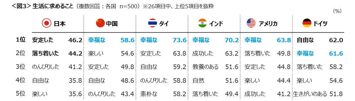 生活に求めることを26項目で聴取した。1位に「幸福な生活」があがった国は、タイ、インド、アメリカ、中国。ドイツは1位が「自由な生活」であり、僅差で2位に「幸福な生活」がついている。日本は5割を超えるものはなく、1位「安定した生活」2位「落ち着いた生活」3位「のんびりした生活」が上位と、平穏無事な生活を望む意識が強く、他の5か国とは一線を画す。また、インドは2位に「成功した生活」があがっており、上昇志向がうかがえる。<図3>
