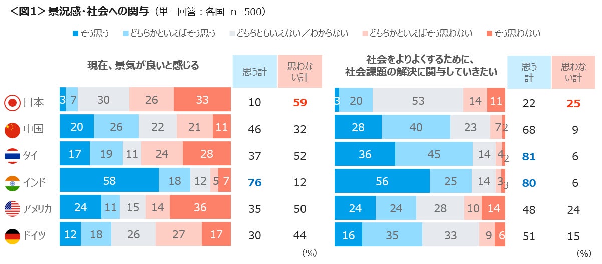 「現在、景気が良いと感じる」割合は、経済成長の著しいインドが76%と群を抜いて高い。「社会をよりよくするために、社会課題の解決に関与していきたい」は、タイが81%、インドが80%と高い。日本は、景況感、社会関与ともに6か国の中で最低値。<図1>