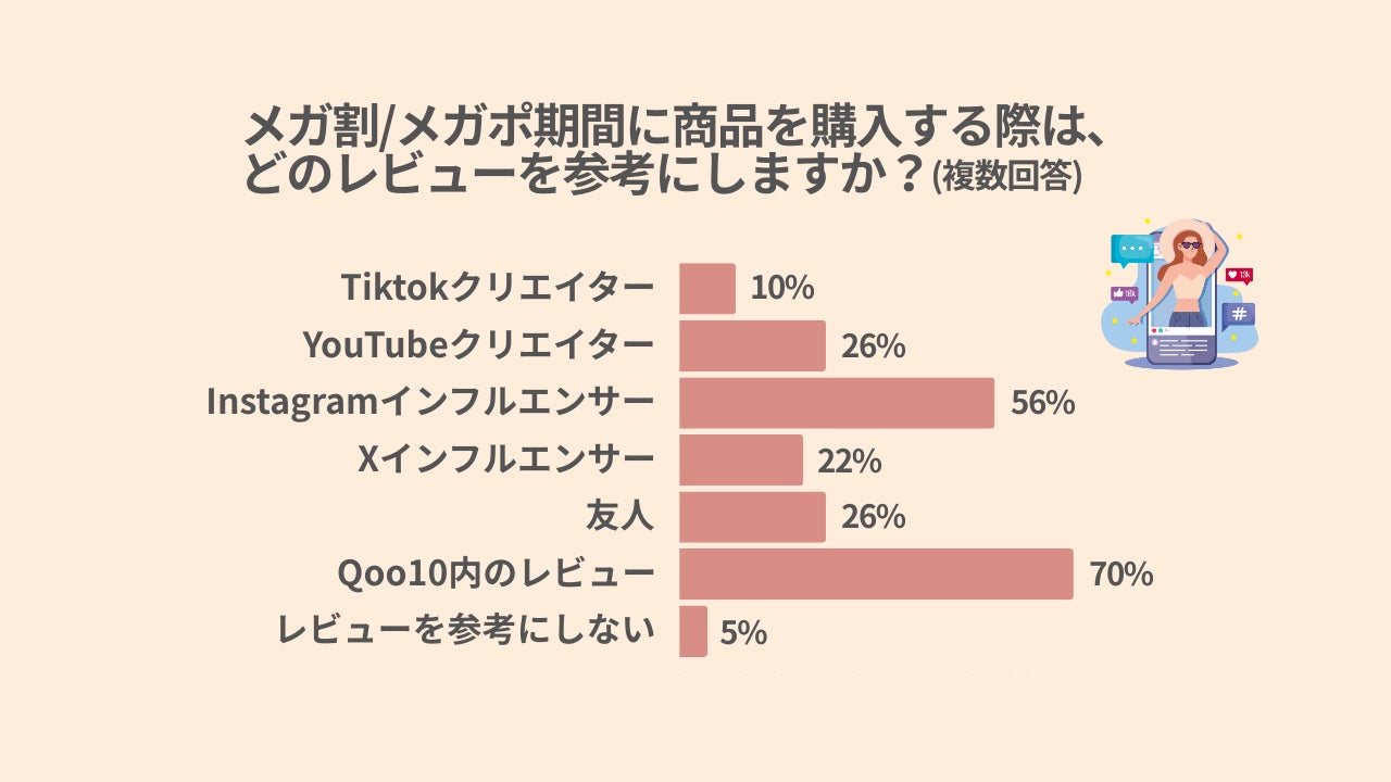 ④メガ割/メガポなどのセール期間中に商品を購入する際は、「Qoo10内のレビュー」を参考にする人が70%と最も多く、「Instagramのインフルエンサー投稿」を参考にする人が56%と次に多い結果となった。