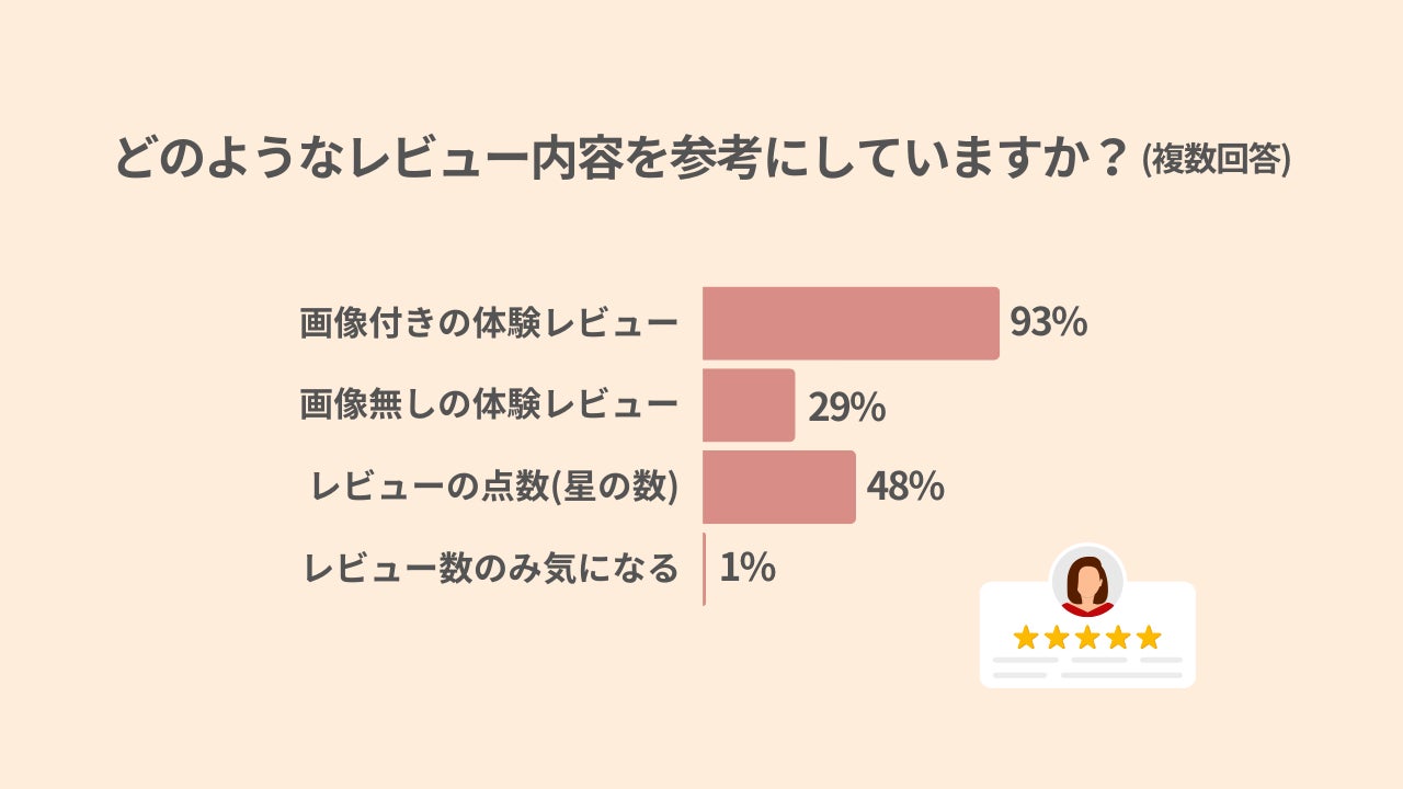⑤参考にしているレビューは「画像付きの体験レビュー」が93%と最も多い結果となった。