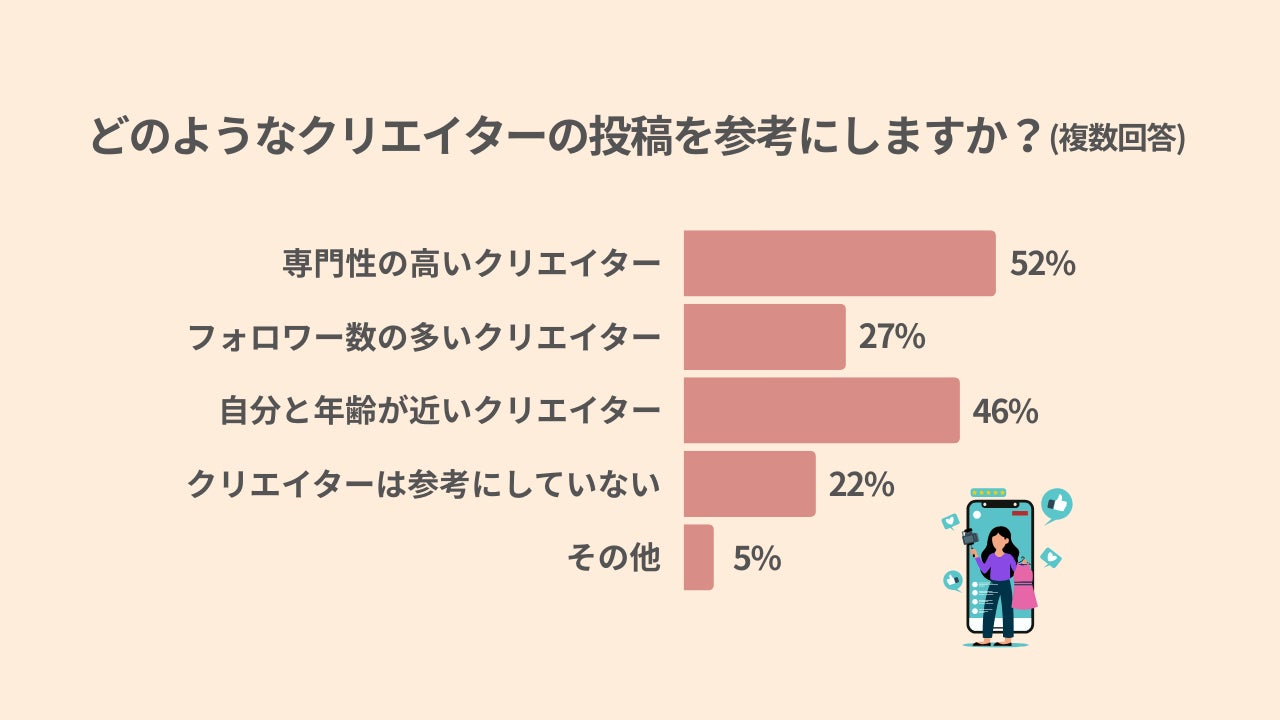 自分と年齢が近いクリエイターは肌質や金額感などを参考にしていると考えられ、専門性の高いクリエイターは「より質の高い商品の発掘したい」「専門性の高いクリエイターが発信しているから安心」といった感情が生まれていると推察している。