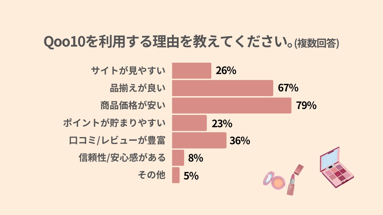 ①Qoo10を利用する理由は「商品価格が安い」が79%と最も多く、「品揃えの良さ」が67%と次に多い結果となった。