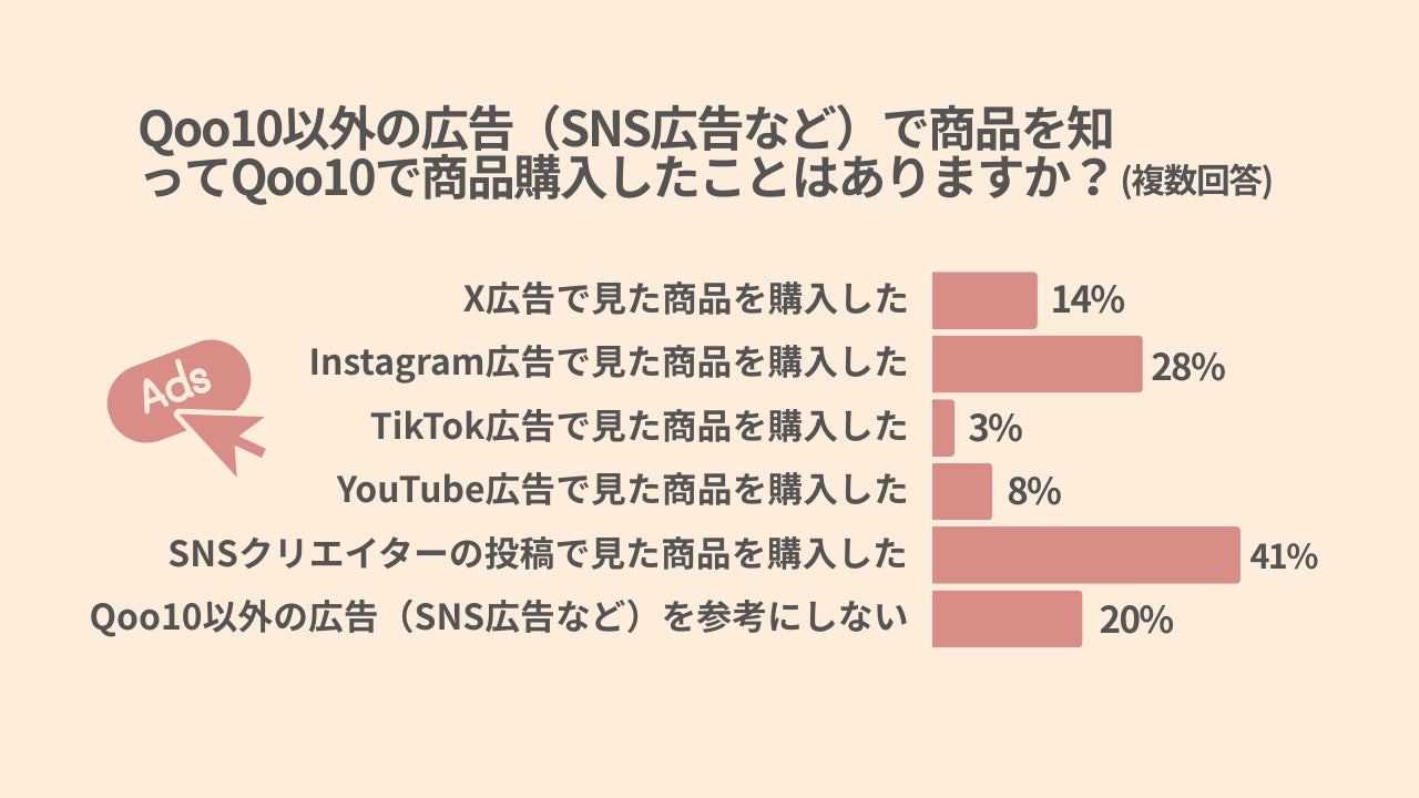 ⑥Qoo10の広告以外に「クリエイターの投稿」を見てQoo10で商品を購入した人が41%と最も多く、「Instagram広告」を見てQoo10で商品を購入した人が28%と次に多い結果となった。