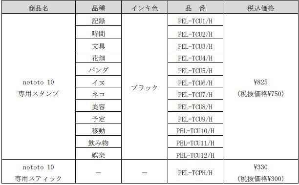 「nototo 10 専用スタンプ」の印面セットは、記録、時間、文具など12テーマに沿った絵柄となっています。また、「nototo 10 専用スティック」は、「nototo 10」の専用ケースで、お好きな専用スタンプや補充インキパッドを収納して、オリジナルの「nototo 10」を作ることができます。ペンケースに収まりの良いスティック型のミニスタンプなので持ち運びにも便利!お家だけでなく外出先でも手軽に手帳時間が楽しめます。インキは裏抜けしづらく、油性顔料なので水性ペンでカラフルに色を塗ったデコレーションも楽しめます。