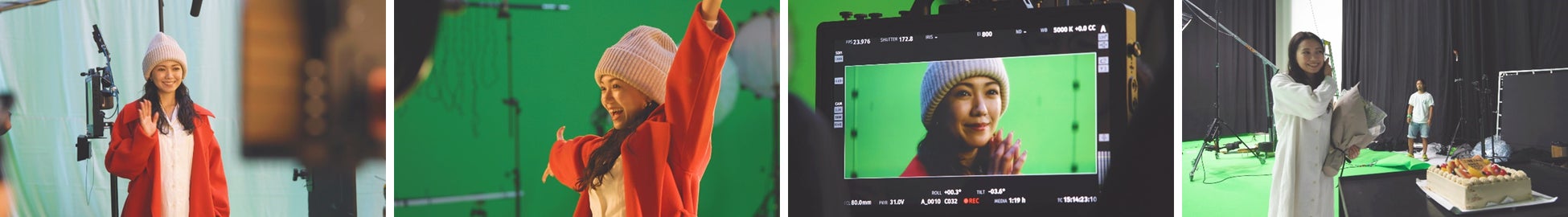 グリーンバックのスタジオに白いニット帽とシャツに赤のコートを着た二階堂さんが登場し、背景も衣装も全てがクリスマスカラーの中での撮影となりました。