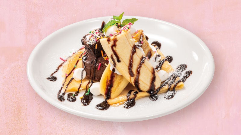 クレープ生地にチョコアイス、マシュマロ、バナナをのせ、チョコソースとチョコスプレーで仕上げたプレートデザート。フォークとナイフで食べるスタイルで、見た目もどこか懐かしく、ほっこり甘い一皿です。