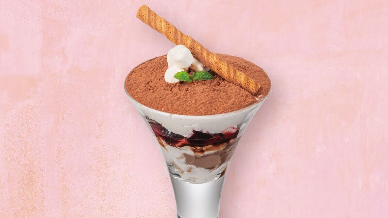 グラスの縁まで食材を平らに盛り付け、仕上げにココアパウダーをふりかけて洗練された雰囲気に。甘さの中にほんのりベリーの酸味が広がり、食後でも食べやすい味わいにまとめました。
