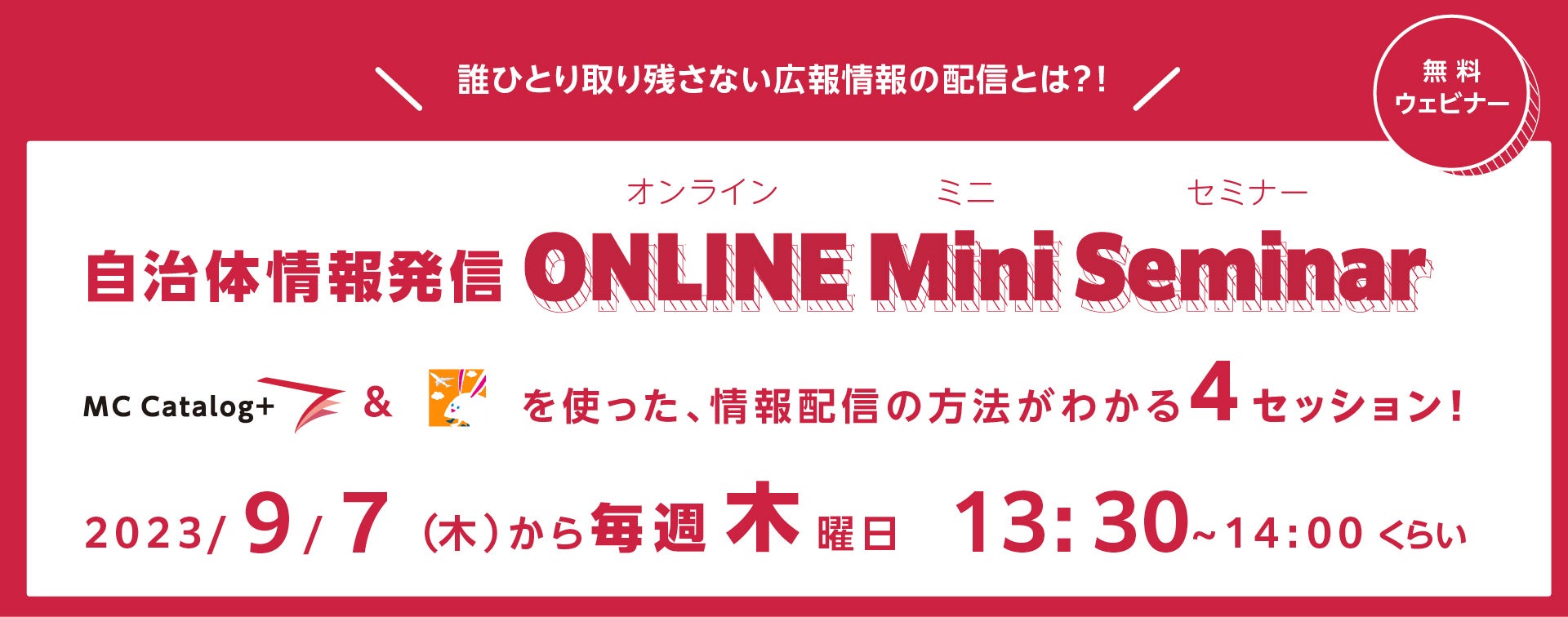 今回は、自治体広報にMCCatalog+を導入する際の疑問にお答えする機会として、採用自治体の事例や製品機能のご紹介など、各回テーマが異なる約30分間のミニセミナーをご用意しました。気になるテーマのセッションを選び、いずれも無料でご参加いただくことができます。自治体広報に求められている、誰ひとりとして取り残さない、きめ細やかな情報配信のためのヒントをお届けします。