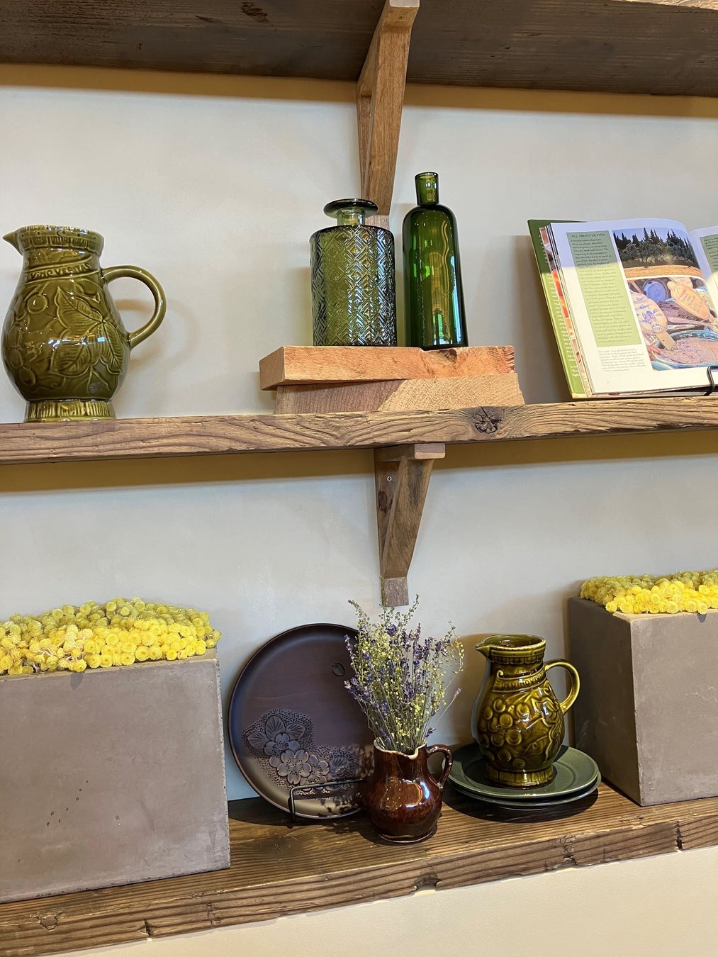店舗のクローズや改装時に発生した木材や家具をアップサイクルし、新しい什器として再生。ショップのテーブル什器は100%アップサイクルされた家具で構成されています。また店内の内装は、テラコッタや木材、ガラスなど自然由来の素材で構成しています。