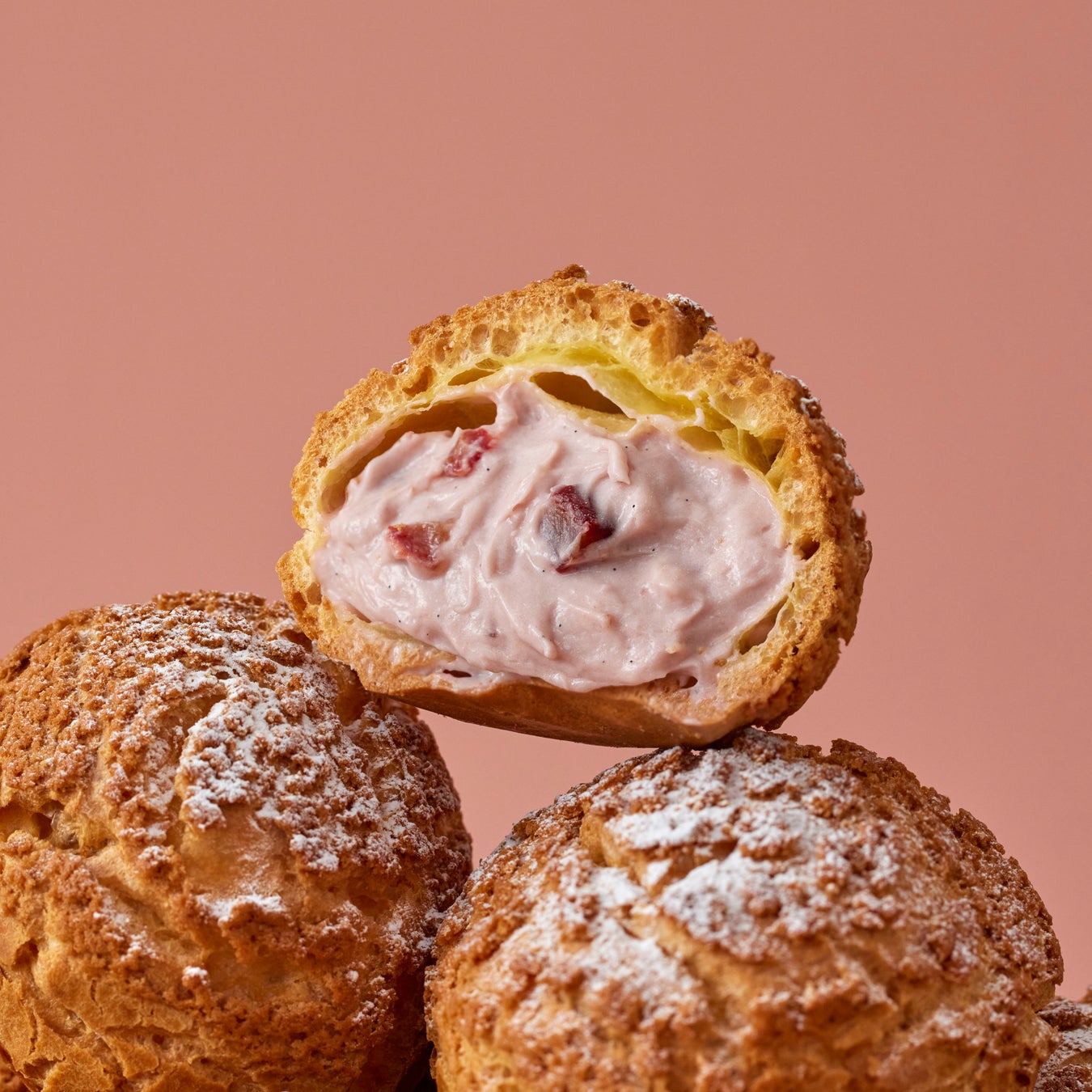 クッキーシューの中には、春を感じる、甘酸っぱい自家製の苺カスタードクリームがたっぷり詰まっています。苺の果肉感が出るよう、粗目にカットされたセミドライの果肉をクリームに合わせました。