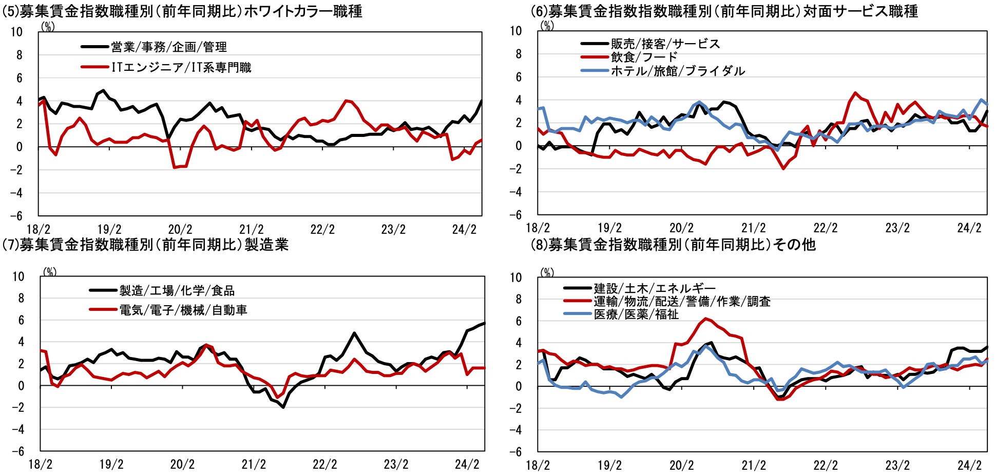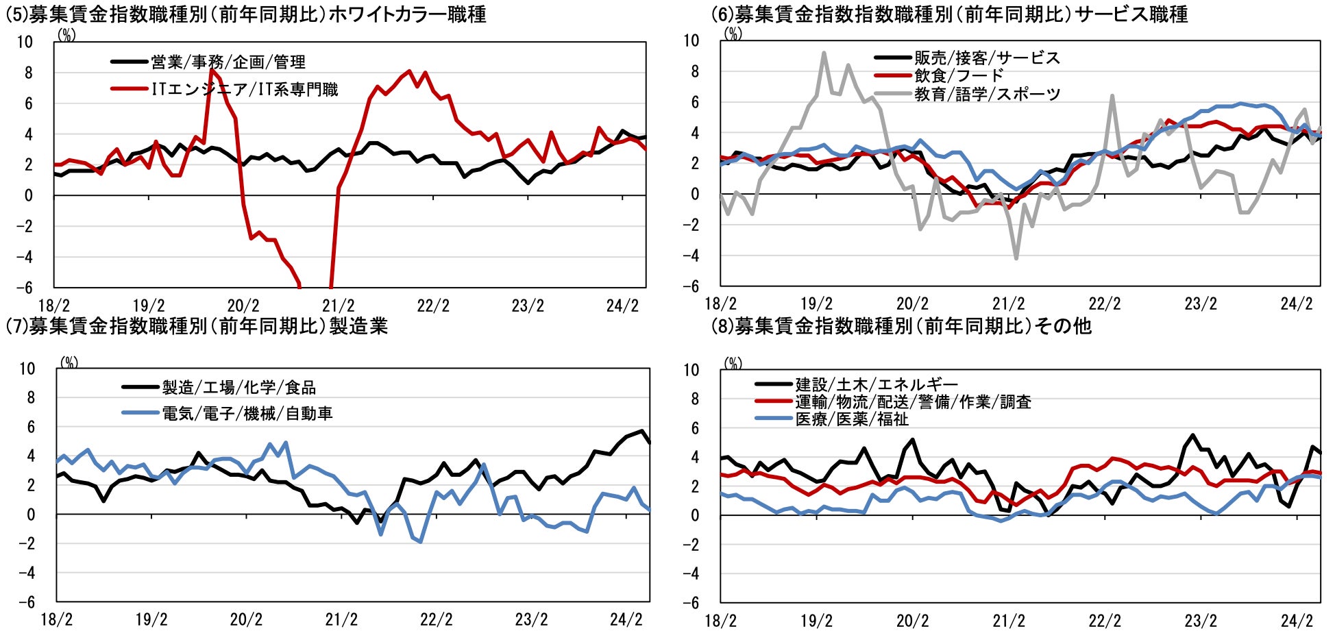 ・「建設/土木/エネルギー」と「製造/工場/化学/食品」は、4月からやや減少しているものの高い水準を維持している。これらの職種では求人数も大きく増加している。産業技術系の職種で人手不足が賃金に反映される状態が持続していると考えられる。