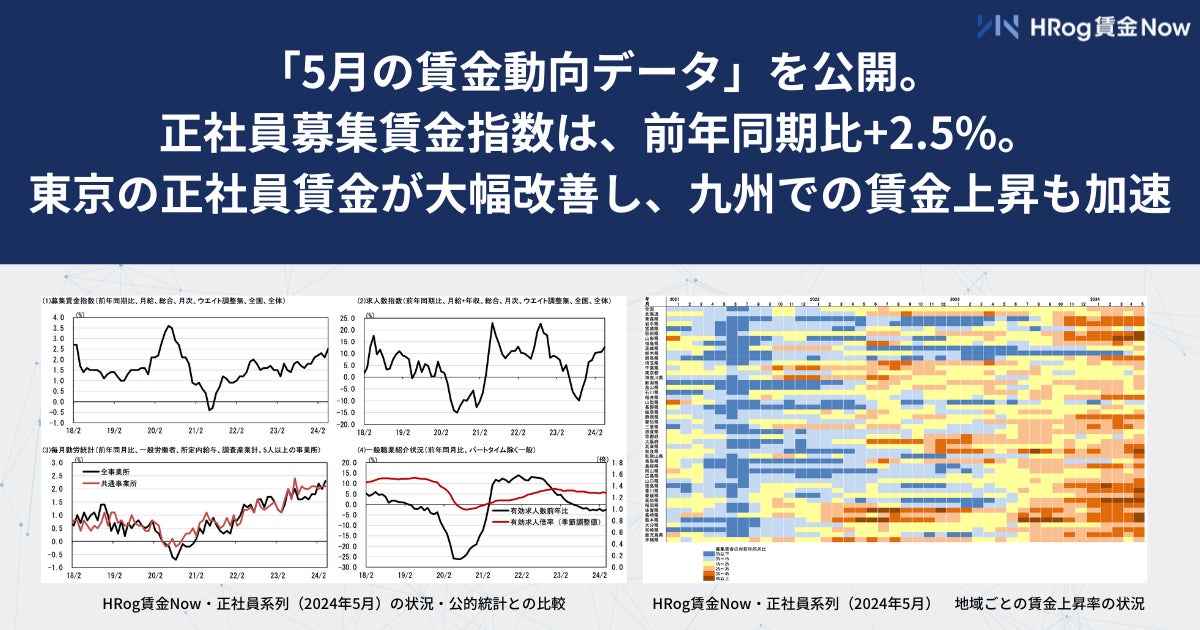 「5月の賃金動向データ」を公開。正社員募集賃金指数は、前年同期比+2.5%。東京の正社員賃金が大幅改善し、九州での賃金上昇も加速