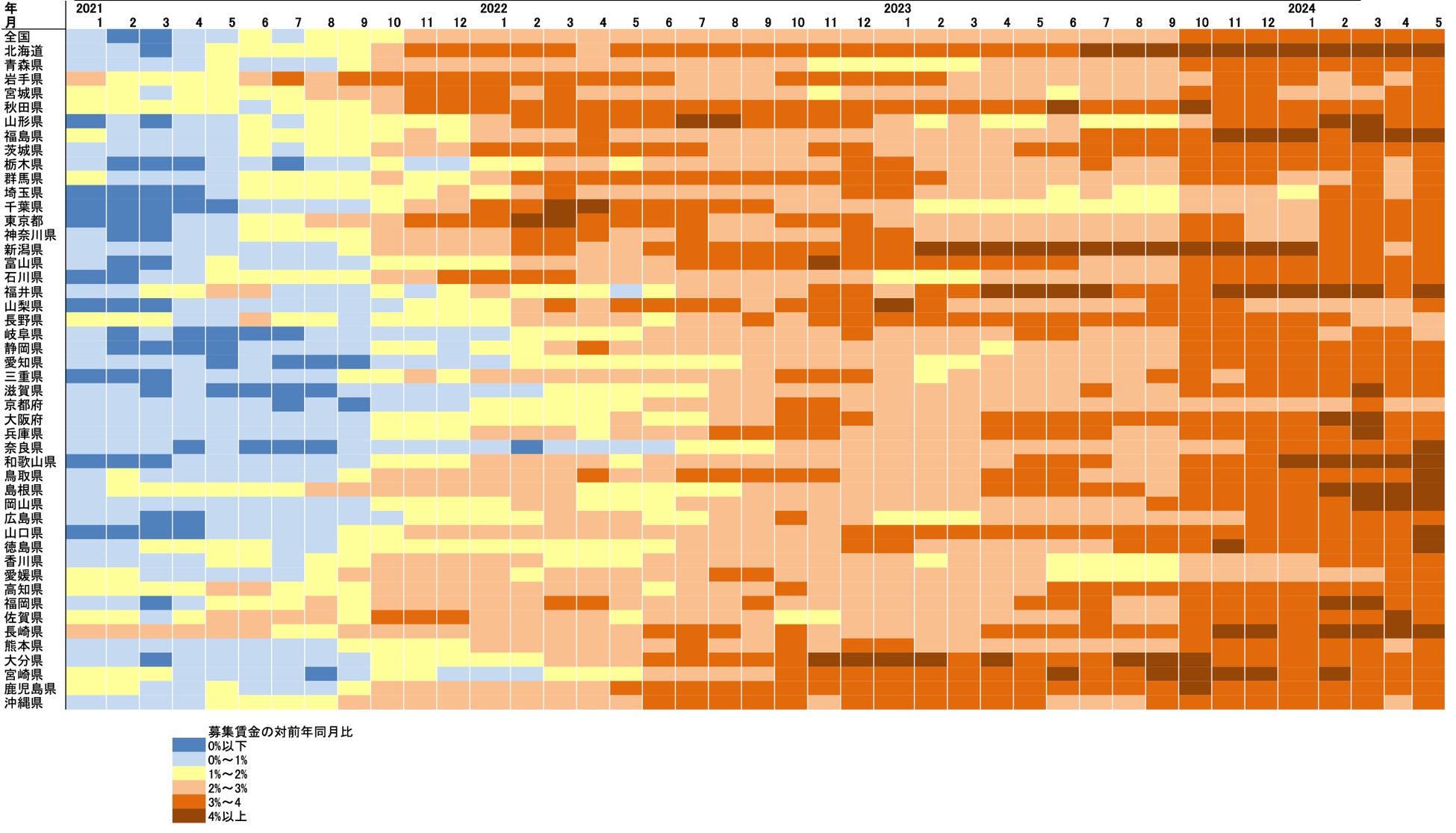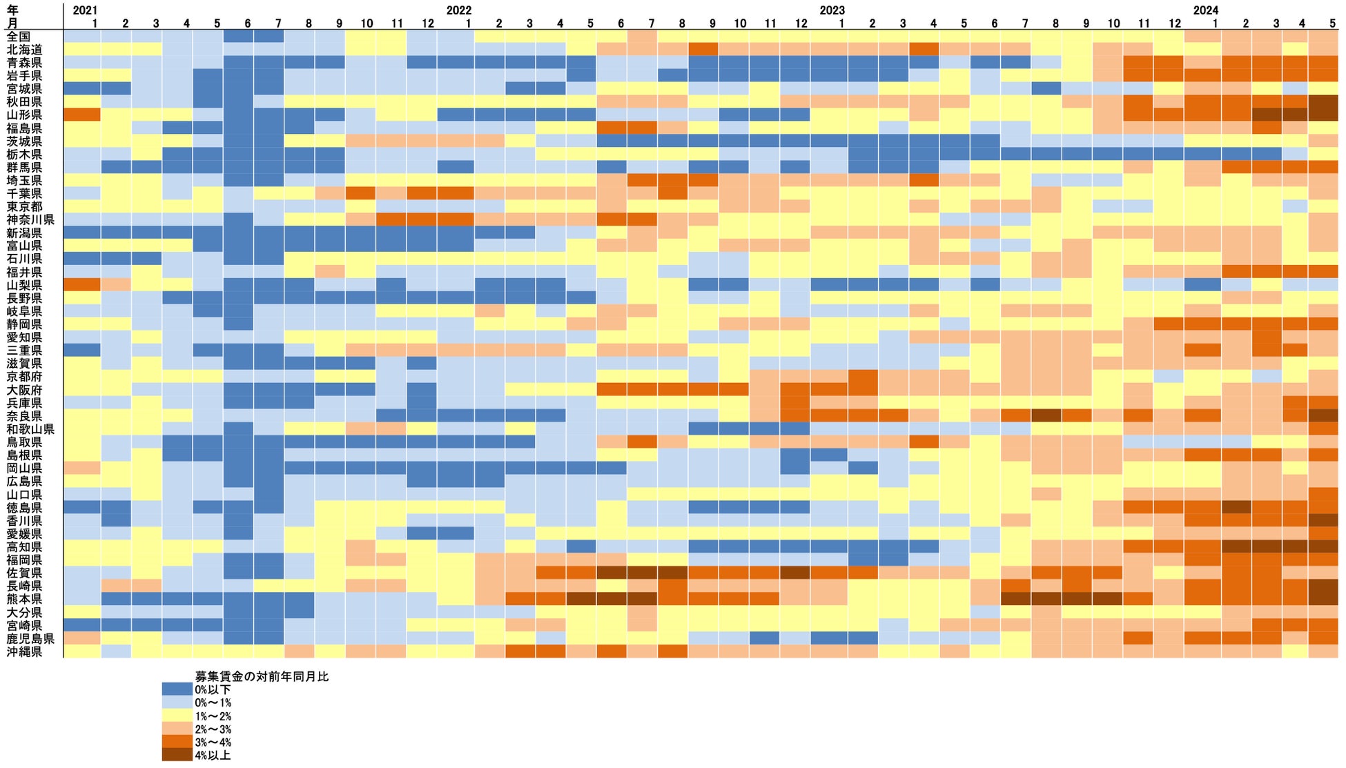 ・正社員募集賃金の上昇率は4月と比べて横ばいまたは改善した都道府県が大半を占める。東京は4月の+0.7から5月は+1.4%と大きく改善し、他の県との差が縮まった。
