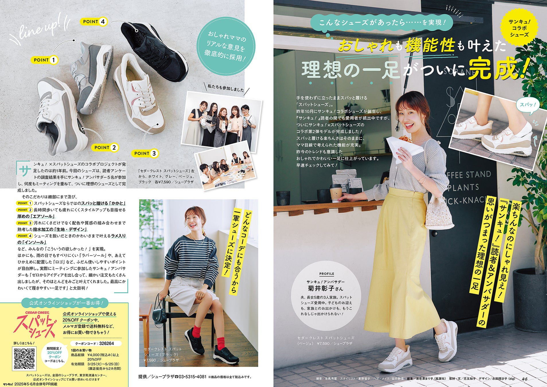 サンキュ!×スパットシューズのコラボスニーカーは、3月25日(火)に発売された雑誌「サンキュ!」の中でも紹介されており、全国のシュープラザや東京靴流通センター、公式オンラインショップ「kutsu.com」などでお買い求めいただけます。手を使わずに立ったままスパッと履ける「スパットシューズ」を是非お試しください!