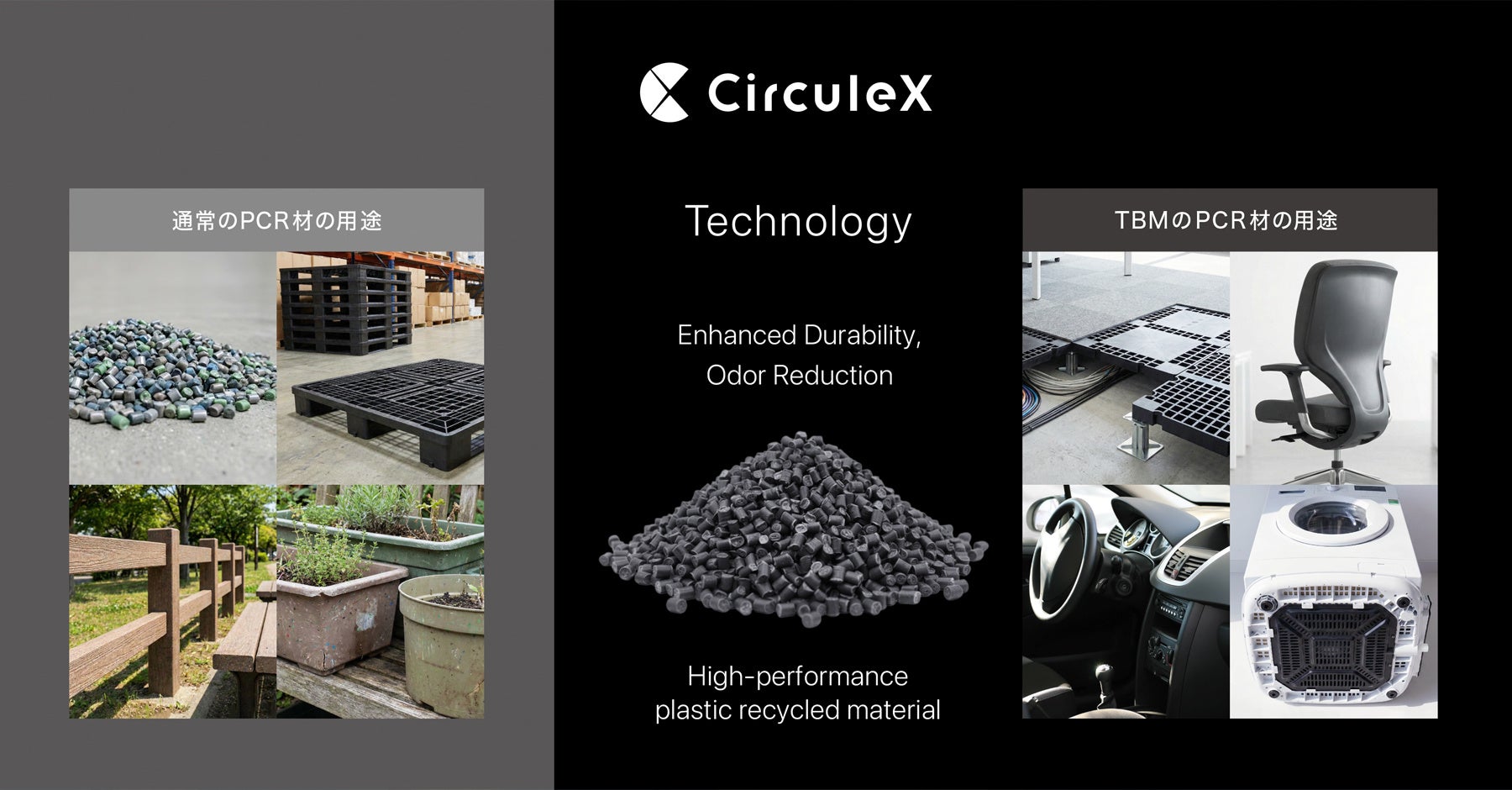 こうした中、TBMは、LIMEX事業で培った素材開発の独自の配合・混錬技術や横須賀サーキュラー工場のプロセス改善を通じて、PCR材の強度不足や臭気改善といった品質課題を抜本的に解決し、供給逼迫と価格高騰が続くPIR材やバージンプラスチックの製品用途に活用可能な高機能再生材「CirculeX」の開発に成功しました。