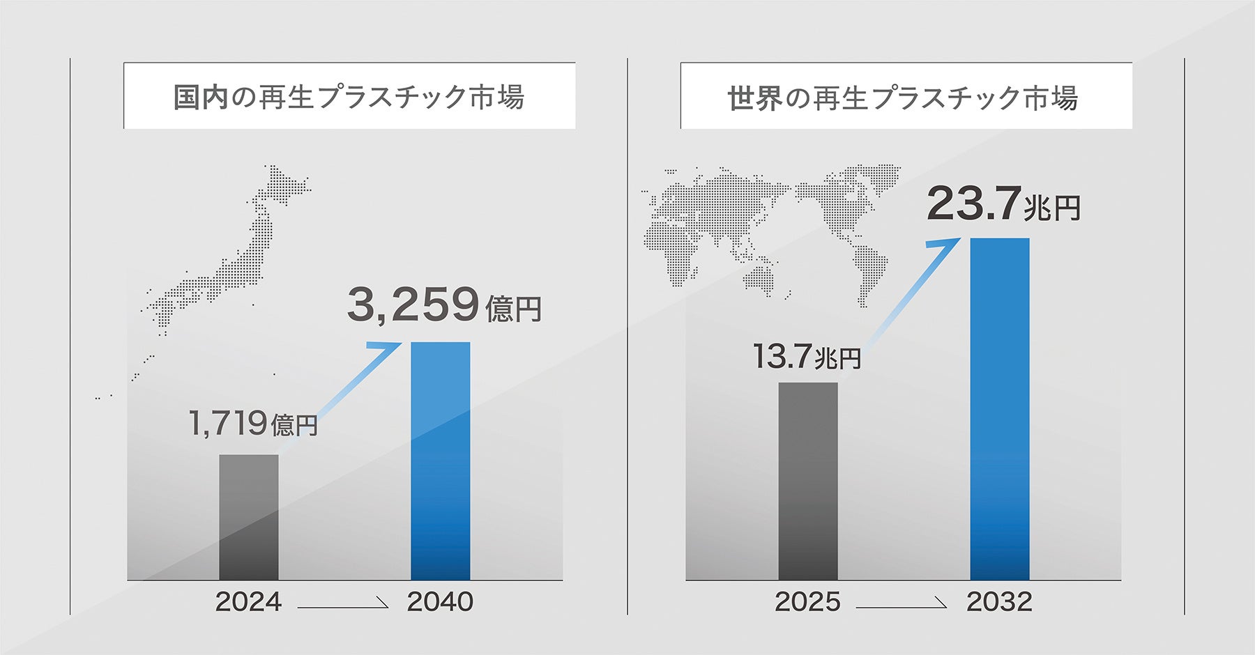 現在、各国でプラスチックの資源循環に関する法規制が強化されています。EUでは「包装・包装廃棄物規則(PPWR)」に基づき2030年までに包装廃棄物の55%をリサイクルする目標が設定され*1、英国では再生材含有率が30%未満のプラスチック製品に対する課税制度が導入されました*2。日本国内においても、廃プラスチックの処理は依然として焼却に大きく依存しており、マテリアルリサイクル率はわずか20%にとどまっています*3。プラスチック資源循環促進法に基づき2030年までにプラスチックの再生利用を倍増させる目標が掲げられるなど*4、プラスチックの再生利用の拡大が強く求められています。こうした潮流を受け、国内の再生プラスチック市場は、2024年には約1,719億円、2040年には約3,259億円規模*5、世界の再生プラスチック市場は、2025年には約13.7兆円、2032年には約23.7兆円規模に達すると予測されています*6。このような市場の環境下において、高品質な産業廃棄物由来の再生材は需要の急増に対して供給が逼迫している上、調達難易度は上昇しており、価格も高騰しています。一方、使用済みプラスチック由来のPCR材は、食品残渣に起因する臭気や材料の強度不足などの品質課題が残るため、国内で再商品化される製品用途は主に使い切りのパレットや土木建築用資材の充填剤などに限定されており、法改正に伴う回収品目の拡大により2030年には回収量が170万トンまで増加する見込みとされていますが*7、供給が限られる市場です。