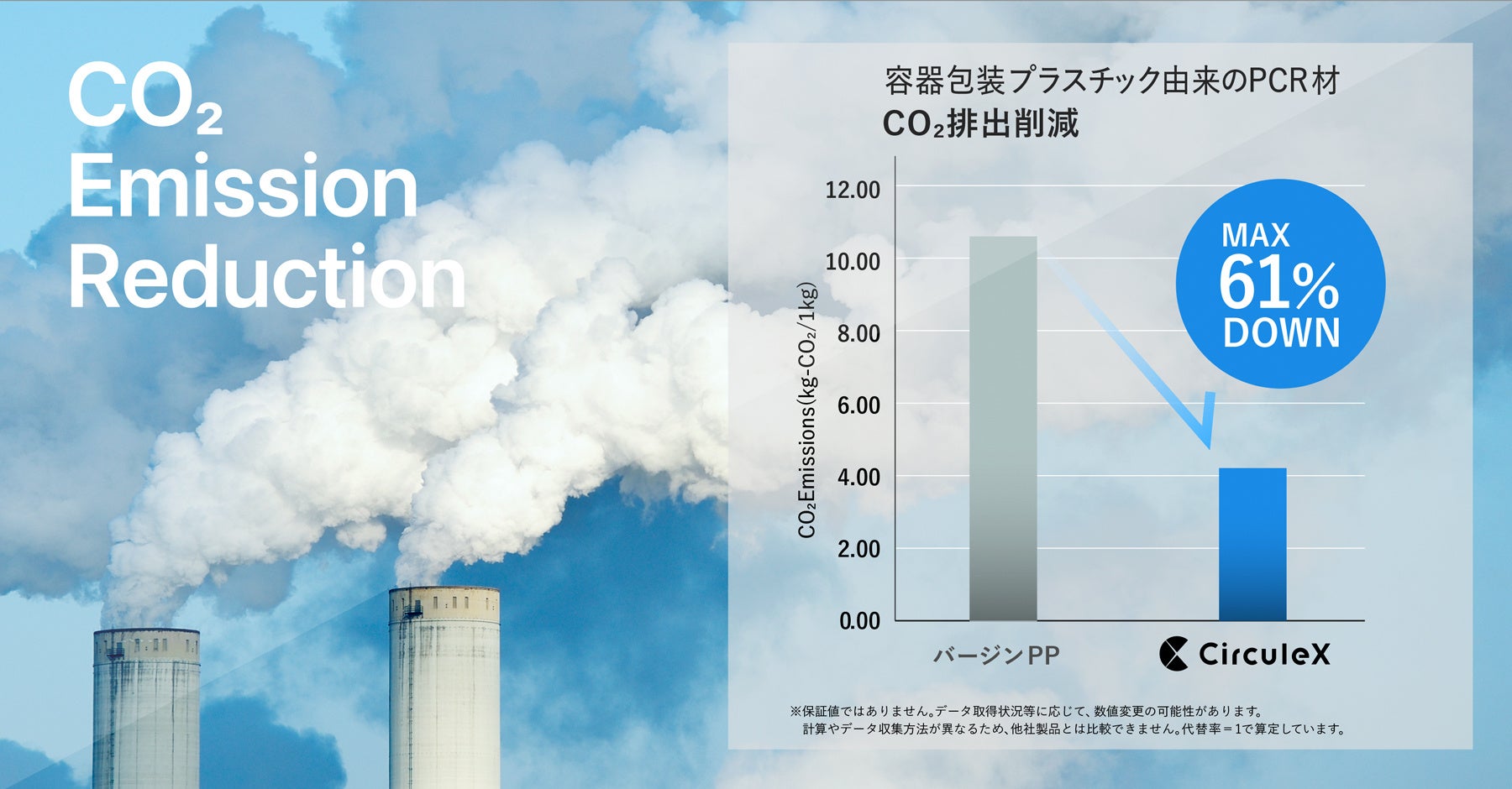 マテリアルリサイクルが出来ない使用済みプラスチックは、主に燃料として利用し、その排熱を回収するサーマルリカバリーという方法で燃焼を伴う焼却処理されてきました。「CirculeX」は、バージンプラスチックと比較して、1kgあたり最大6.43kg(最大61%相当)*のCO₂排出量を削減します。