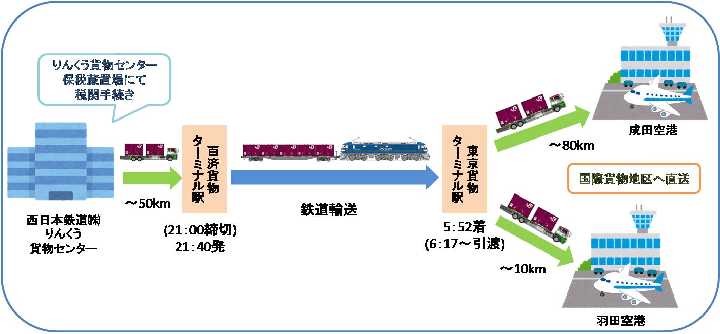 このたび、西日本鉄道株式会社 国際物流事業本部 (本部: 東京都中央区、 以下、西鉄)、センコー株式会社(本社:大阪市北区、以下、センコー)、日本貨物鉄道株式会社 関西支社(大阪市北区、以下、JR貨物関西支社)は、大阪府泉佐野市の西鉄りんくう貨物センター (以下、西鉄りんくう)から、成田・羽田空港国際貨物地区への航空貨物の保税運送における鉄道輸送を開始します。2022年9月よりテスト輸送を開始しており、本格稼働は2023年4月開始を予定しています。