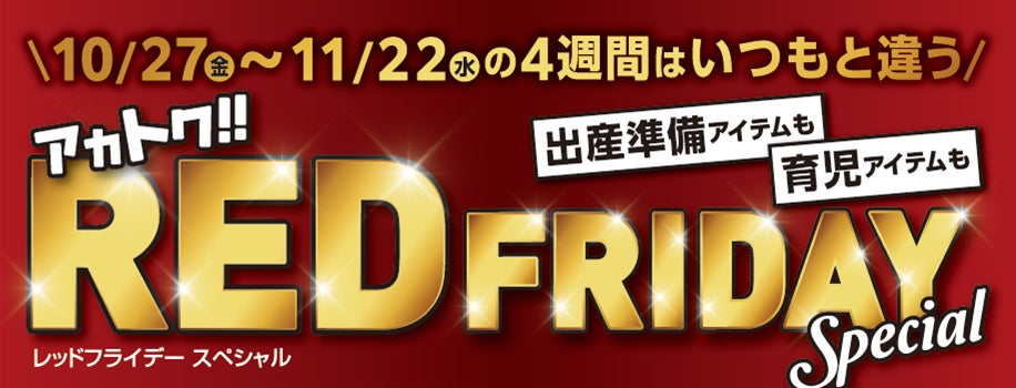アカチャンホンポでは、ブラックフライデーに代わり『レッドフライデー』としてお買い物を楽しんでいただき、出産準備用品や育児用品など、バイヤーが厳選したイチオシ商品を特別価格でお届けします。
