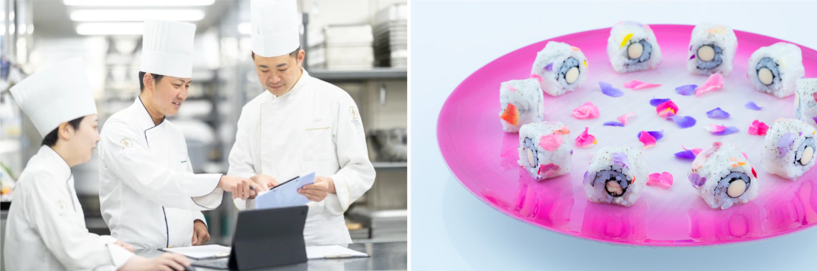 (左)ロゴ/(真ん中)メニュー開発の様子/(右)八芳園の過去のフードプロデュース例