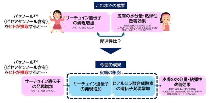 ピセアタンノールを含むパセノール™の摂取は、これまでのヒト試験により皮膚水分量や皮膚粘弾性の改善効果が示されており、本研究では、ヒト皮膚線維芽細胞を用いて皮膚でのピセアタンノールの作用メカニズムを検証しました。その結果、ピセアタンノールを作用させることで、長寿遺伝子とも呼ばれるサーチュイン遺伝子の発現が増加することが示されました。また、ピセアタンノールはサーチュインを介して、肌の水分保持などに重要な役割を担うヒアルロン酸合成酵素の遺伝子発現を増加させている可能性が示されました。