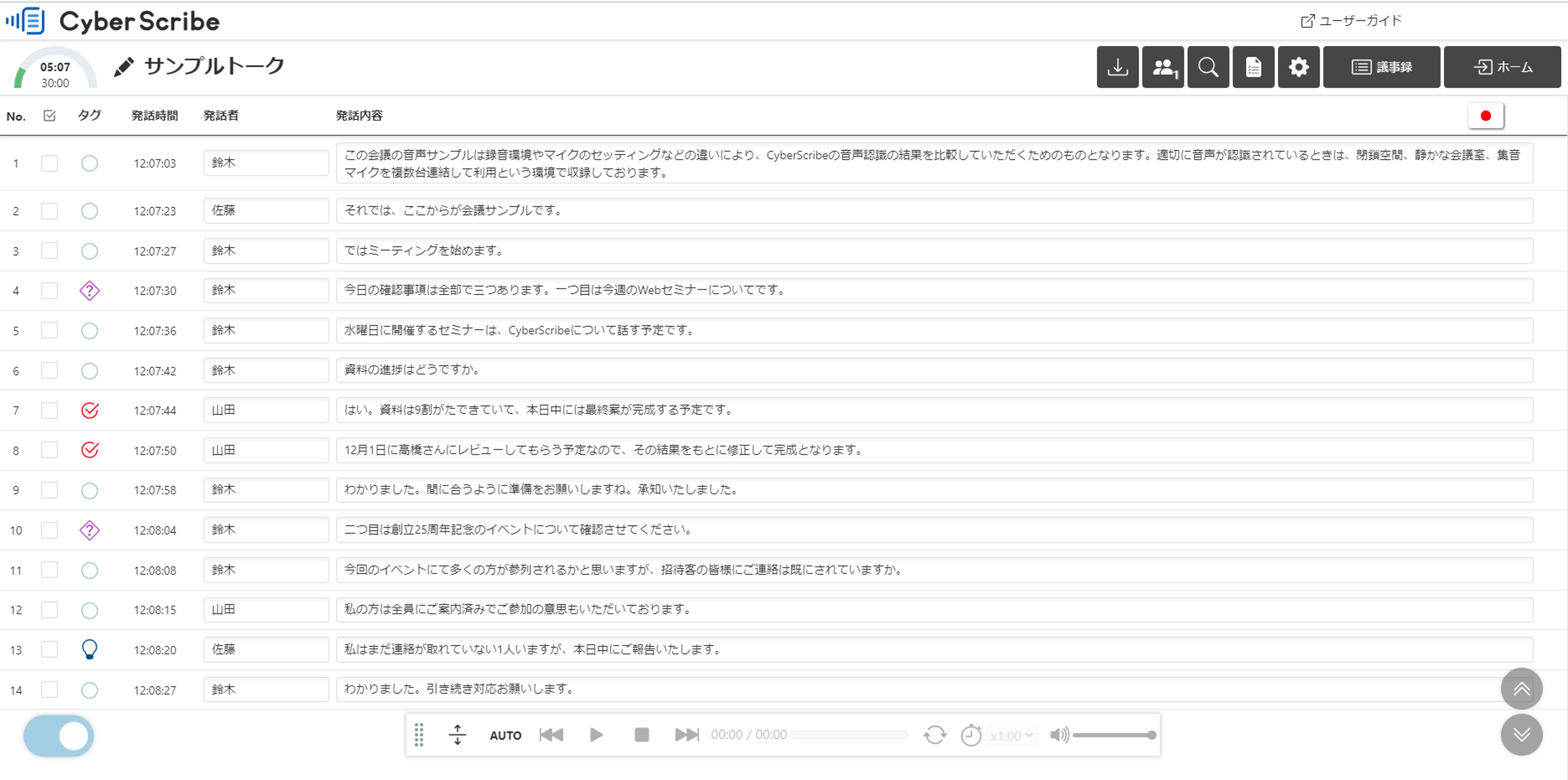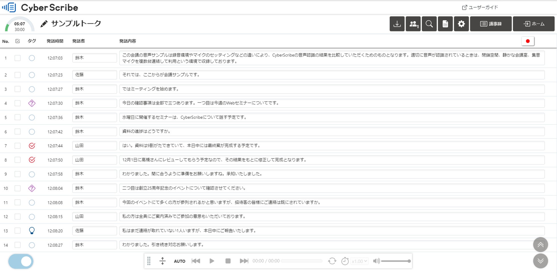 あらかじめ設定したキーワードを含む発言や特定の発話者の発言に対して、自動的にタグを付与し、重要な発言の抽出を省力化します。