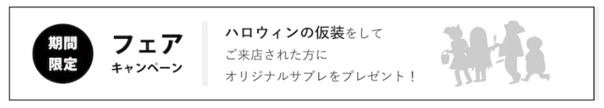 2022年10月1日(土)〜10月31日(月)迄の期間中、ハロウィンの仮装をしてご来店された方にオリジナルサブレをプレゼントしています。